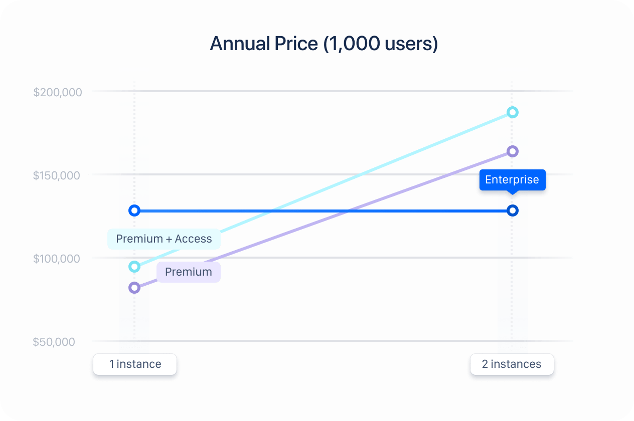Organizations with multiple product instances can benefit from the Enterprise plan’s centralized per-user licensing model as one Enterprise seat is more cost-effective compared to two Premium or Premium + Access seats.
