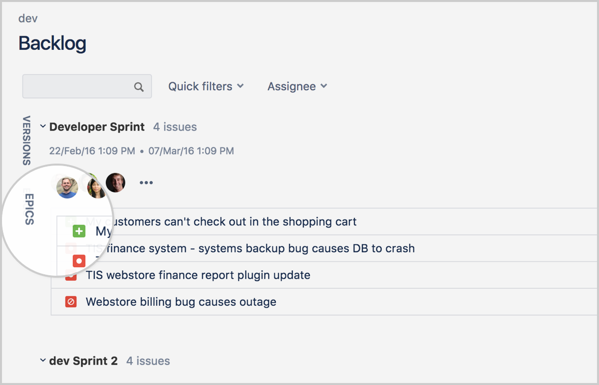 エピックで課題を表示:エピック名をクリックして、すべてのスプリントにわたりそのエピックに属する全課題を表示します。